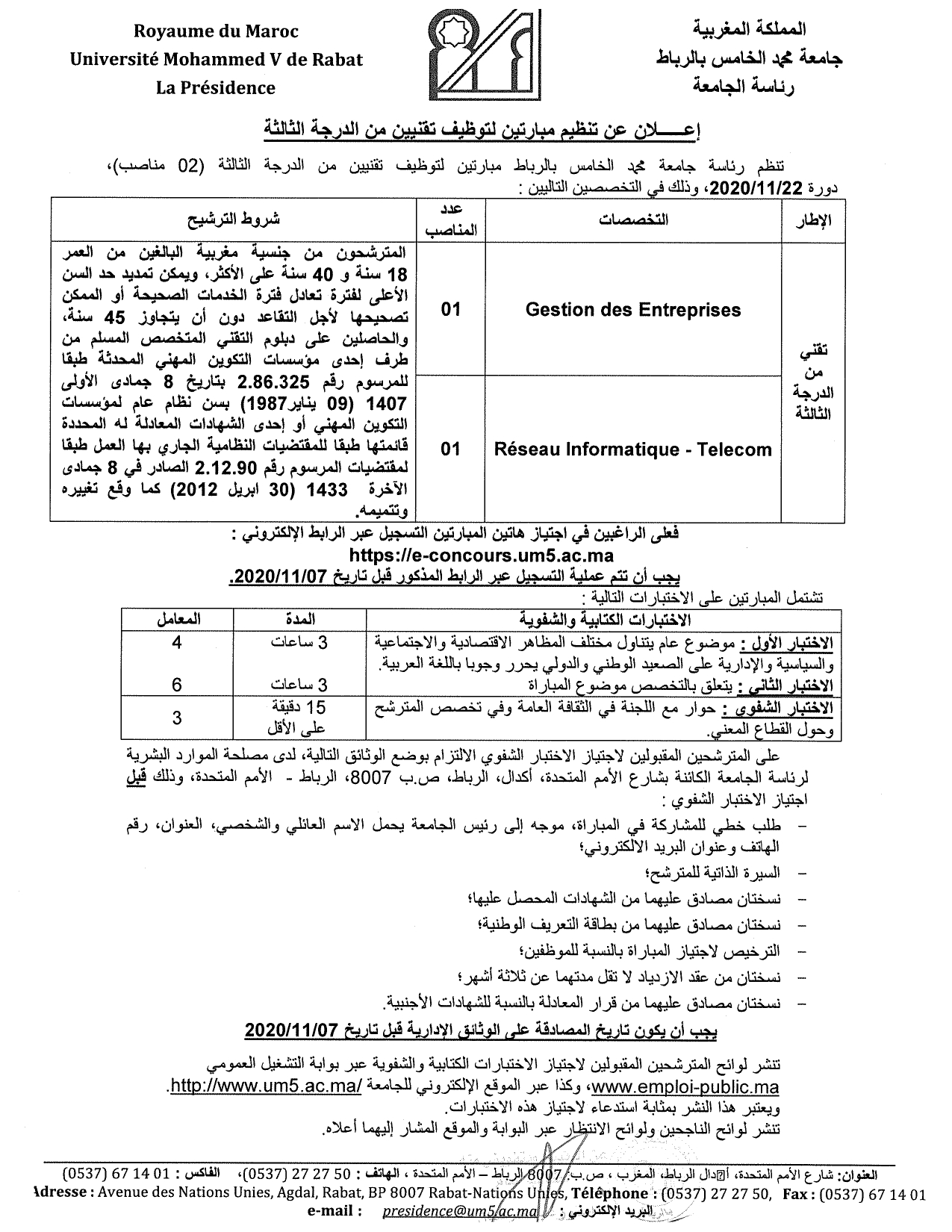 Concours Alwadifa Concours Université Mohammed V 2020 (07 Postes) Concours Université Mohammed V 2020 (07 Postes)على الراغبين في اجتياز هذه المباريات التسجيل وجوبا عبر الرابط الإلكترونيhttps://e-concours.um5.ac.ma/يجب أن تتم عملية التسجيل عبر الرباط المذكور قبل تاريخ 07 نونبر 2020 You may like these posts