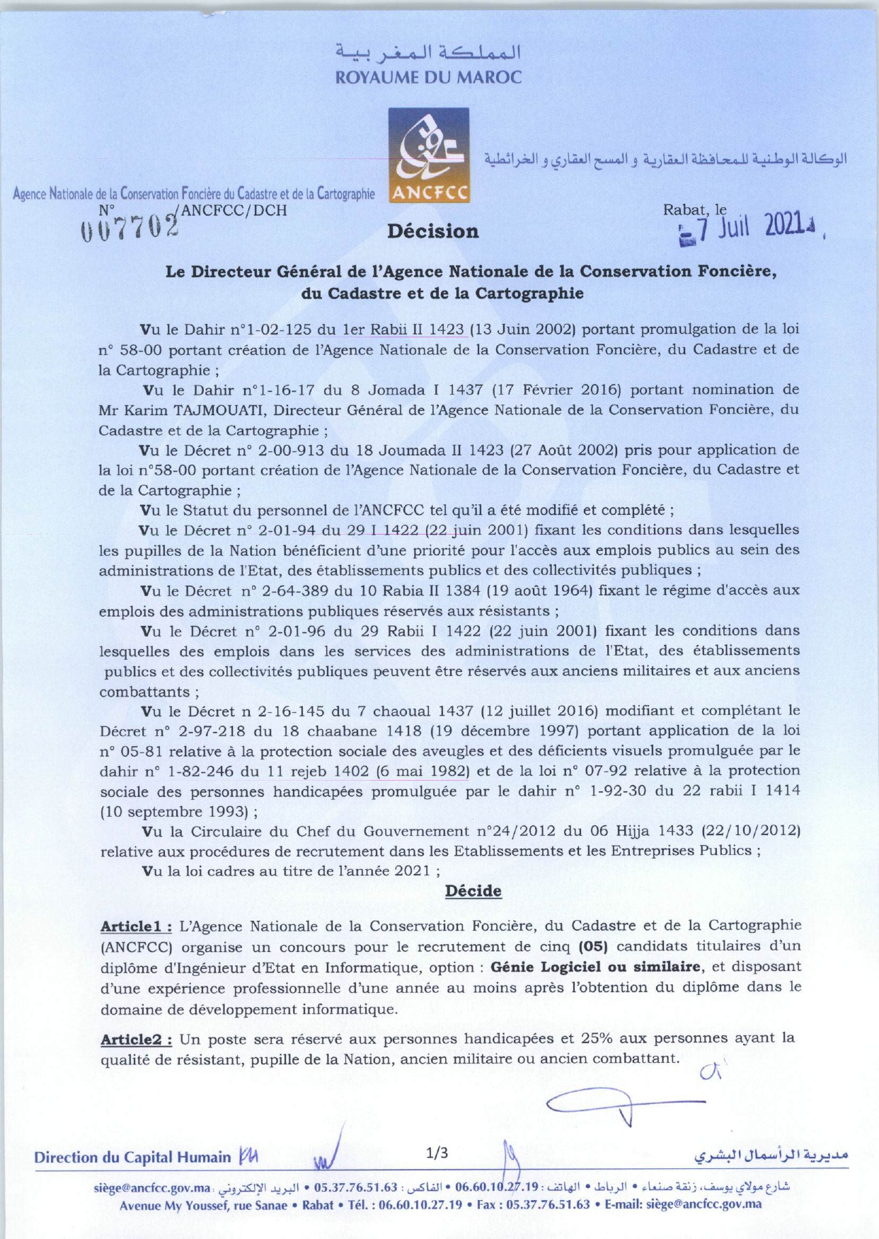 L’Agence Nationale de la Conservation Foncière, du Cadastre et de la Cartographie ANCFCC organise un concours pour le recrutement de 45 postes répartis comme suit: