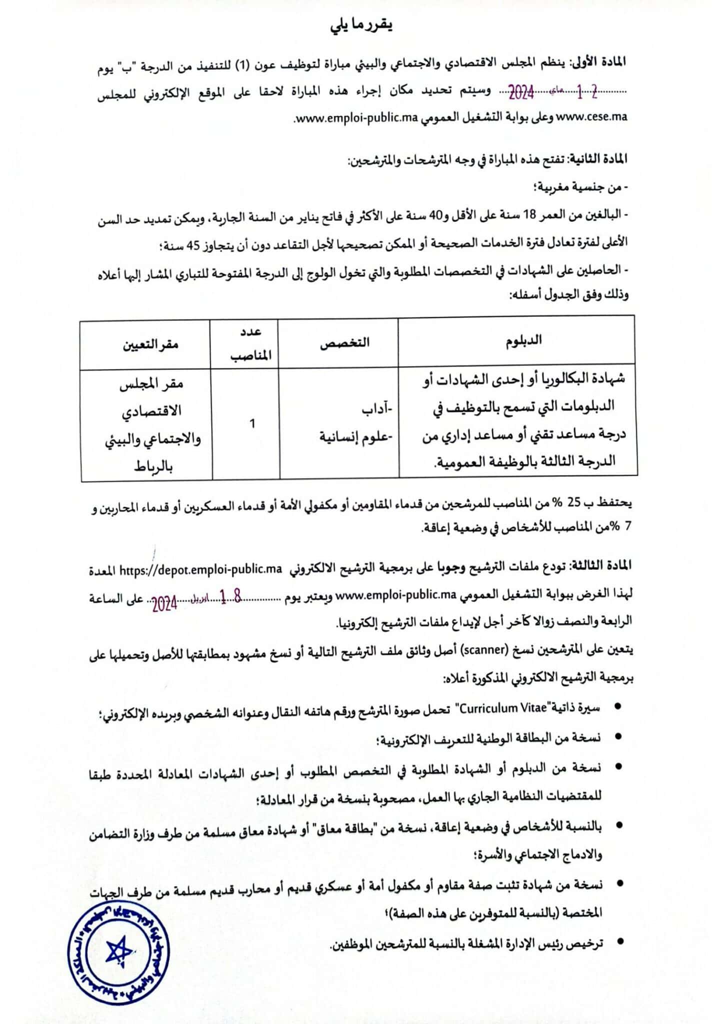 Concours Conseil Economique, Social et Environnemental 2024 (7 Postes), Le Conseil Economique, Social et Environnemental CESE organise un concours pour le recrutement de 7 Postes répartis comme suit:
